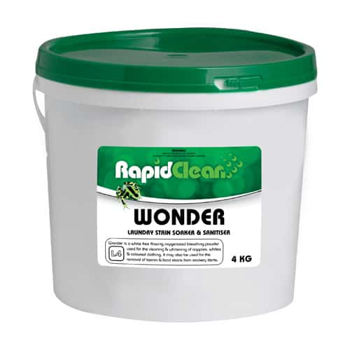 WONDER is a white free flowing oxygenated bleaching powder used for the cleaning and whitening of nappies, whites and coloured clothing. It may also be used for the removal of tannin and food stains from crockery items